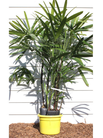 The best container and short landscape palm. A short undergrowth species of palm found originally in the monsoonal evergreen forests of Sumatra and Thailand. The trunks are uniquely covered with leaf scar patterns and are wrapped with matted brown fiber. Shiny green leaves are deeply divided into 1″ strap-like segments and are held erect on 12″ to 18″ stems. A small palm that can be enjoyed indoors and out. It needs little care and can survive brief periods of drought. It can tolerate harsh interior conditions and still look fresh.