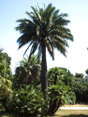 (XL Specimen, 8” Pot) Absolutely the largest cold hardy palm in cultivation. This monster can grow to a height of 50 feet with a massive trunk often reaching 16 feet in diameter. A bit picky about its environment, Jubaea doesn't care for high night time temperatures and is well adapted to a mild temperate climate such zone 8 from Mid-California to Georgia. In its native Chile it is becoming endangered due to wine production which requires the tree be cut down to collect the sap for fermentation.