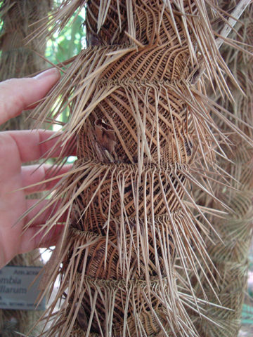 Zombia is a strikingly attractive palm with a trunk that looks to be wrapped in burlap and needles. This exotic unusual palm grows dense multi-trunked clumps that can reach 10 feet tall with trunks that are 2 to 3 inches in diameter. This palm is highly valued for its unique appearance, small stature and salt tolerance.